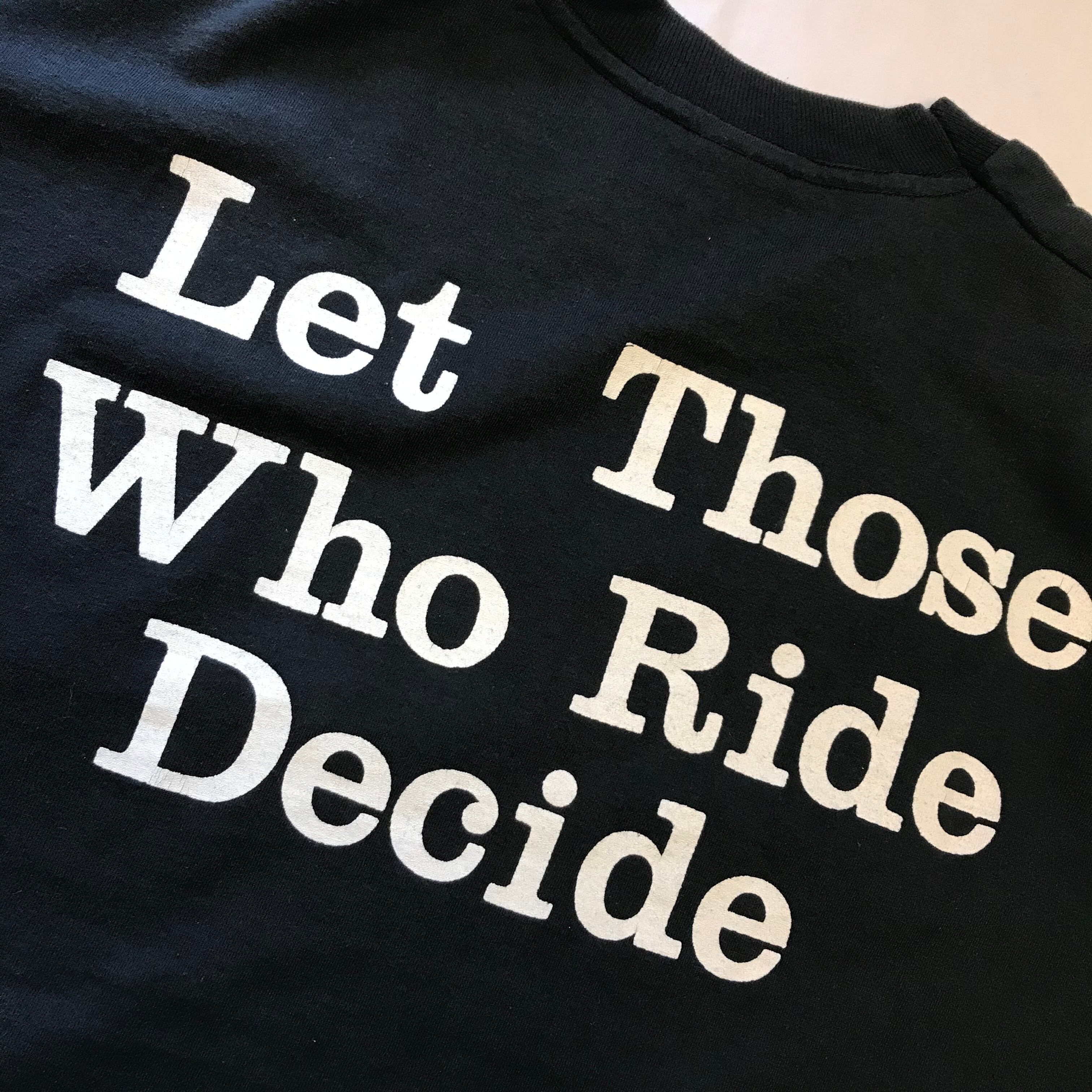 フロントに”helmet laws suck”ヘルメット何てクソくらえ!とプリント!バックには”let those who ride decide”乗る奴に決めさせろ!とプリントされてます!日本ではヘルメットしましょう!シンプルでボディも古いのでTシャツ好きな方は是非!